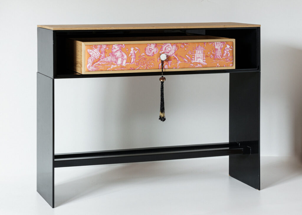 Ambas consolas aprovechan el hueco del mueble para incluir un cajón, pero mientras que el del modelo Tokio está así mismo teñido de negro, logrando una fusión visual completa con el fondo del mueble, la consola Kioto se presenta con el frontal del cajón vestido de tejido estampado de algodón ‘Toile de Jouy’ con dibujos asiáticos y rematado con un tirador de alabastro con su característico colgador de hilo. En este caso, el contraste del color de la tela con el fondo negro resulta de una elegancia muy sofisticada y ayuda a enmarcar las líneas del cajón.