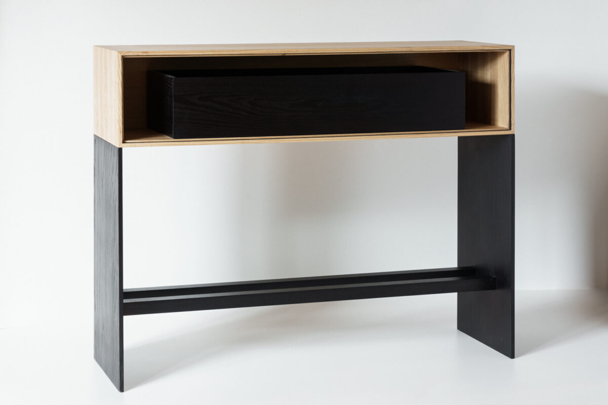 Diseñadora: Marta Labrador | Materiales y acabados: Madera de fresno teñido en negro y color natural, tejido estampado de algodón y laca brillo en negro con tirador de alabastro | Medidas: 130 x 35 x 100 cm
